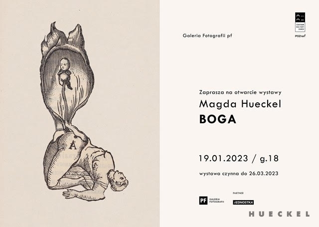 Źródłem większości prac Magdy Hueckel jest jej osobista historia, a podstawowym narzędziem pracy własne ciało. Wystawa „Boga” przedstawia istotny obszar artystycznych poszukiwań autorki – fascynację materiałami archiwalnymi i dialog z nimi. Poprzez różnego rodzaju dekonstrukcje obrazów, zaczerpniętych z astronomicznych, botanicznych czy anatomicznych atlasów oraz medycznych dokumentacji, artystka dotyka zarówno tematów związanych z kobiecą cielesnością, jak i z kontekstami społeczno-kulturowymi.