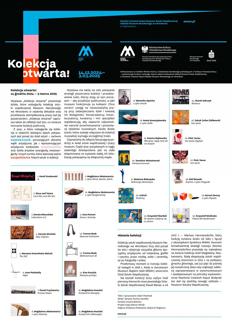 Magdalena Hueckel, Natalia LL, Dorota Nieznalska, Ewa Partum, Joanna Rajkowska, Bożenna Biskupska, Ewa Zarzycka, Olaf Brzeski, Łukasz Korolkiewicz, Jerzy Kosałka, Slavs&Tatars, Krzysztof Wodiczko… to tylko niektóre nazwiska artystek i artystów, których prace zostały zakupione do zbiorów Muzeum Narodowego we Wrocławiu. Na wystawie pokazane zostały wyjątkowe dzieła, które wzbogaciły kolekcję sztuki współczesnej MNWr w ostatniej dekadzie.
