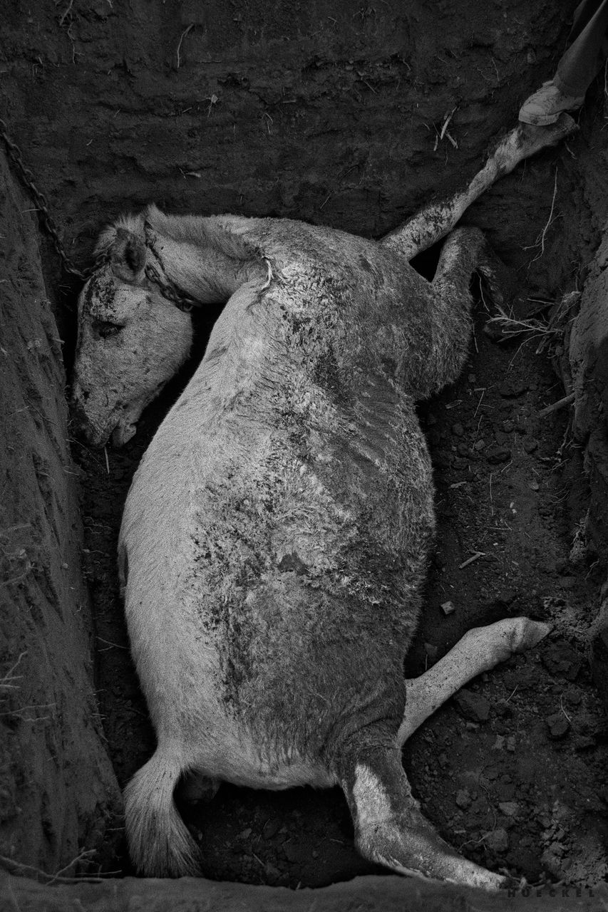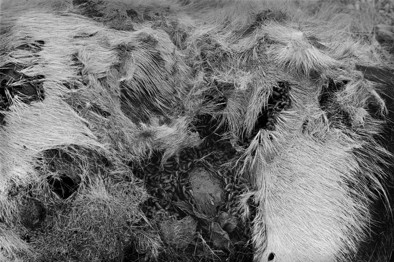“Hueckel subtly guides one through the paths, shows the way, sometimes one fails to notice that the grass by the path is spattered with blood. She leads one on the paths she traces herself, guides the viewer in no uncertain manner, showing that which is worth seeing: a house that caves in, the destructive nature, the death under the blazing sun, death being buried in a hole in the ground, desiccated bodies, a bloated horse. And that mystery interior, where the spirit hunting takes place.”