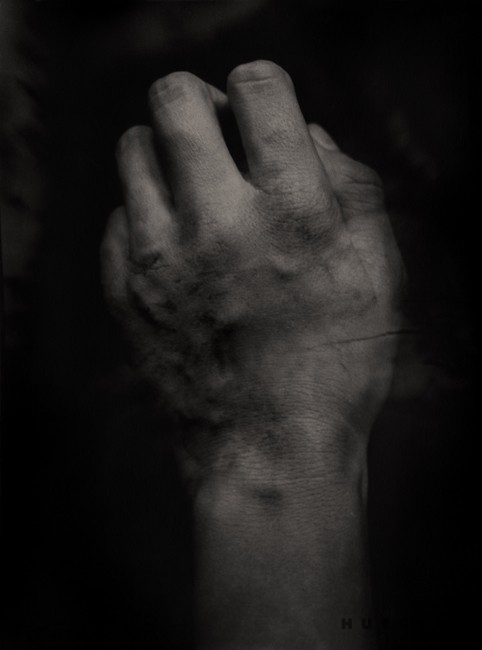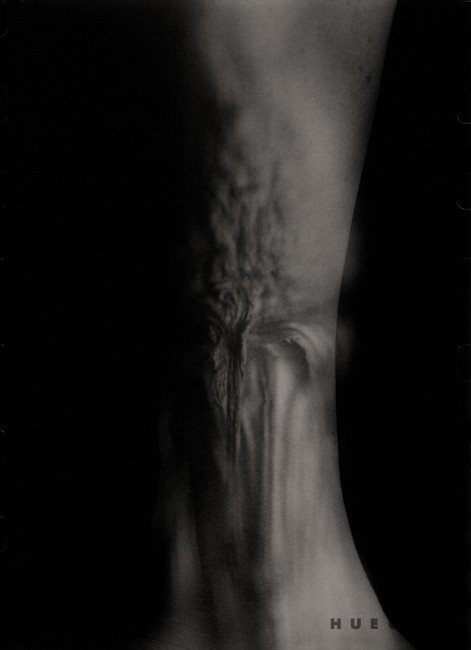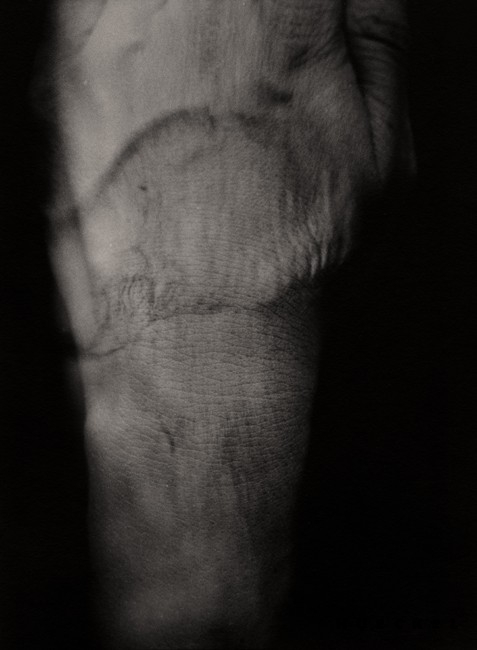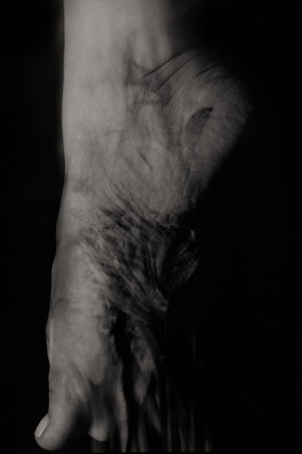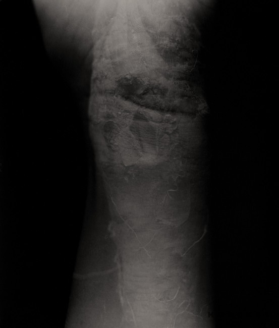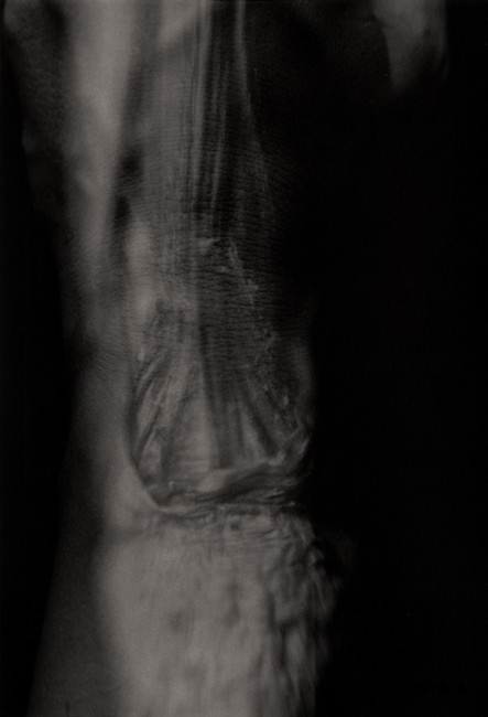 "A transgressive cycle entitled Obsessive Self-Portraits ‘touches’ upon passion in obsession, in its separation from the senses. The pictures search for explanations beyond biology and on the borderlines of the visible. The effect achieved by this multi-exposition, by placement of organic remains on parts of the artist’s own body, ‘inserted’ in black x-ray-like backgrounds, is a gesturing of this pathology. Encumbered with a layer of projected futility, accentuated mutations, monstrous eczema and an eruption of defect, the tissues suddenly come live for the view in a compiled record as morgue-like hallucinations – on the disembodied matter, there come to view its borderlines and incessant temporal processes."
