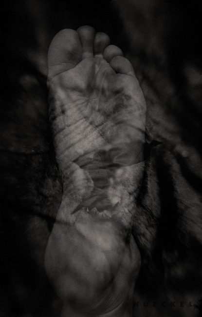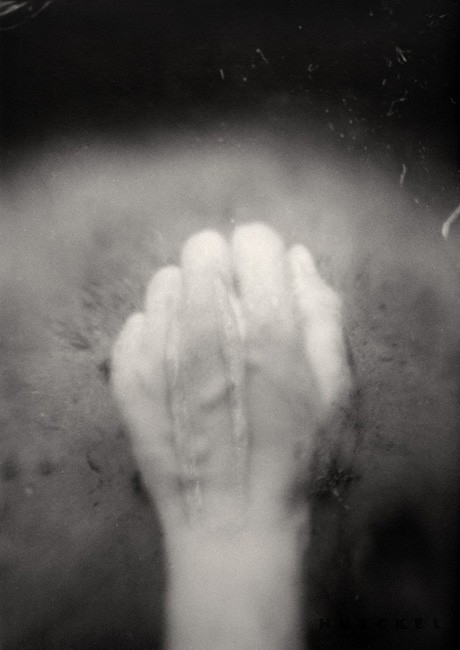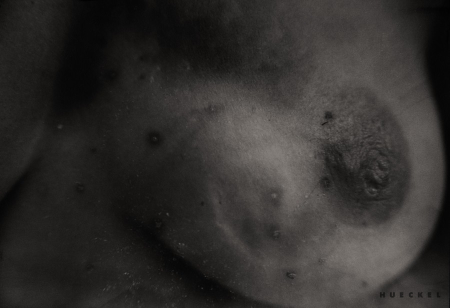 "...The manner in which Hueckel constructs the vision of her obsession is not reduced to taking advantage of the technical potential of the medium only. It is quite meaningful that a self-portrait and still nature in the form of rotten fruit are combined. The artist’s play between the genres produces definite results, as expressed in her works. Body parts emerging from the black background become almost sculptural elements in the pictures. The body, which is treated like an object, is covered with the traits of damage, thus indispensably signifying the process of destruction and of time passing by that is an inherent element of the existence of a living creature. Thus the body assumes the role of an object in a narcissistic still nature. At the same time, a human aspect is present in the still nature, which by definition is deprived of the physical presence of a human being. The transgression occurs only at a visual level, though, as the body substitutes traditional iconography, which refers to the fundamental issues of existence via nature and symbols."